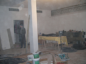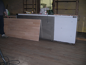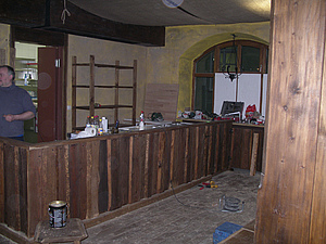 Neben diversen Sitzmöbeln und Tischen wurden Wände, Tresen, Heizkörper und Stahlträger verkleidet (Bohlenwand).