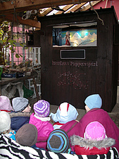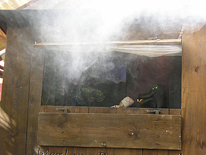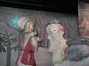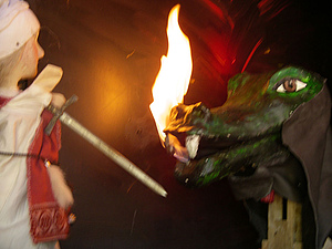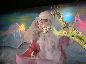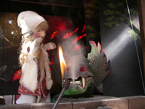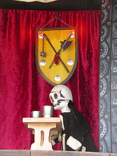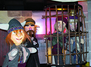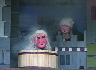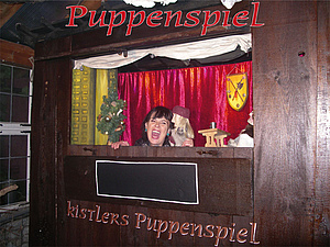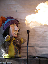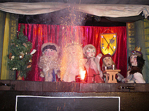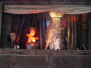 Ob gotische Hobelbank oder ein dampfender Badezuber, die Requisiten sind liebevoll bis ins kleinste Detail gearbeitet. Pyrotechnische Effekte, Feuer und Rauch beleben das Spiel. Es brennt, raucht und schneit in der kleinen Bühne. Ob Drache oder Gaukler, die Figuren spucken Feuer, in der Hölle brennt bengalisches Licht.